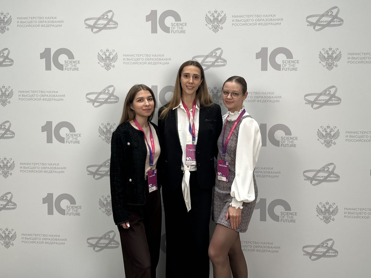VI Международная научная конференция и X Всероссийский молодежный научный форум «Наука будущего — наука молодых» (23-26.09.2025). На фото: Полина Гергележиу, Александра Иванова, Елизавета Бушмина